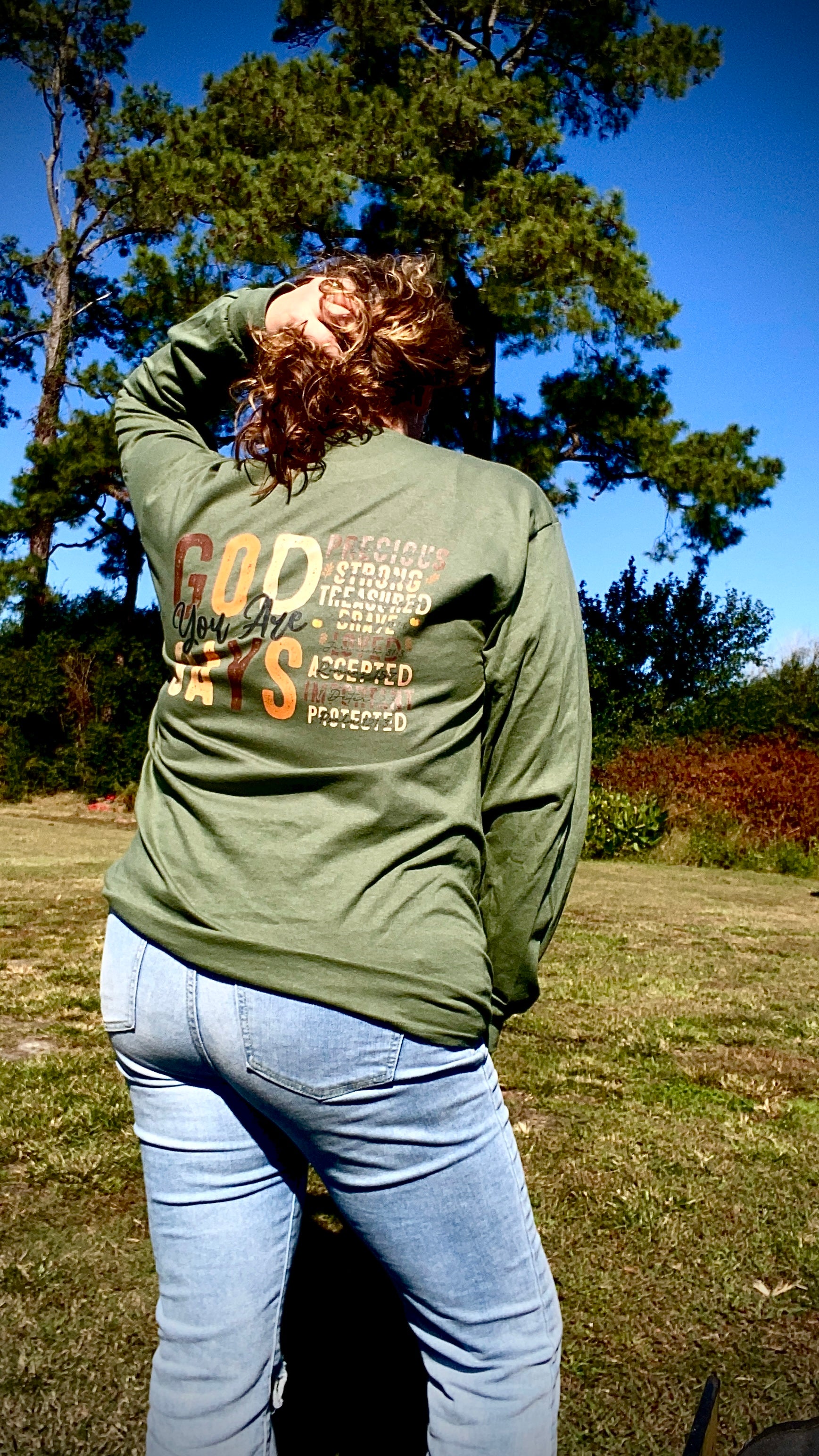 This is a long sleeve military green shirt with a direct to film transfer applied.